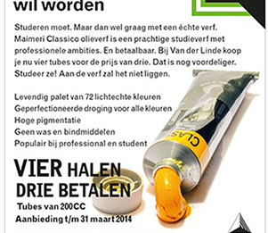 Advertentie voor de vakbladen Palet en Atelier. Boodschap: Maimeri olieverf is een studieverf maar kwalitatief te vergelijken met sommige professionele verven.