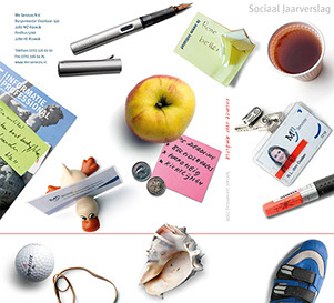 Photoshopbewerking voor het sociaal jaarverslag van Ms Services beelden vrijstaand maken en daarmee visuals componeren alsof de atributen zich op bureaubladen bevinden.