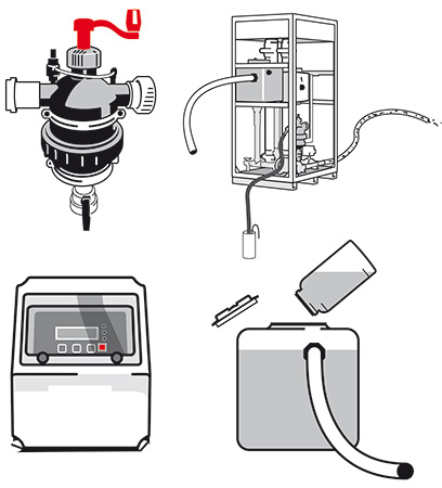 Illustraties voor installaties t.b.v. waterzuivering. Deze worden geplaatst in rurale gebieden. Pictogram-achtige illustraties moeten bediening en onderhoud duidelijk maken.