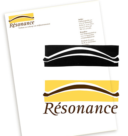 Huisstijl voor Résonance. Verhuur en reparatie van violen, chelli en contrabassen. Het logo stelt voor het bovenblad van een viool. Gegutst uit een massief stuk hout. Door de vorm uit zwart papier te knippen kreeg de vorm karakter.