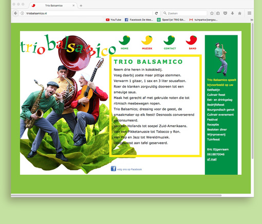 Trio Balsamico maakt vrolijke muziek op culinaire feesten. De site geeft muziekvoorbeelden. Achtergrondinformatie over de muzikanten en boekingsinformatie.